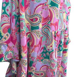 This Emily Wonder women's top features a vibrant paisley pattern with 3/4 dolman sleeves and a stylish V-neckline. The blouse is in size 1X and has a relaxed fit, perfect for casual or travel occasions during the summer, fall, and spring seasons. The lightweight polyester material is adorned with ruffle accents, adding a touch of flair to the colorful design. This pullover blouse is designed for easy care with hand washing instructions, making it a versatile and fashionable addition to any wardrobe.