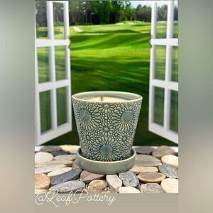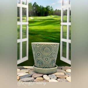 Dimensions: 5.25”H x 5.25”W, Opening 4.9”, weight 1lbs 2.9oz ,Drainage hole, Made in China , Color: Aqua, Material: Ceramic, saucer attached to the planter , Perfect for Indoor/Outdoor gardening, Don’t forget to dress up your plants 🪴