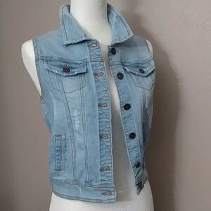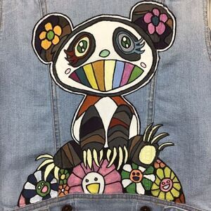 Emma Jeans light blue distressed denim vest w/button front (6 buttons). Size Medium. Waistline has 2 tabs w/buttons creating a tighter fit. 98% cotton, 2% spandex. Hand painted (w/fabric paint) Japanese- style (cartoon, anime, manga) panda on back. This took me 21 hours to paint & is based on a Murakami piece of art. Vest does run small so double check measurements below! Paint did bleed through fabric a little (see photo).