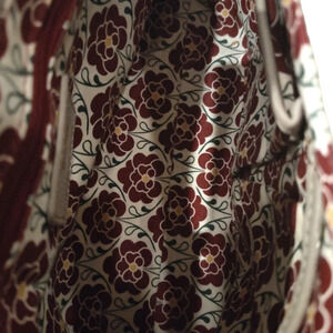 Emma Fox taupe colored, genuine leather, flap design with locking mechanism to keep your items secure. Cute floral detail on the strap. Gold hardware and a pretty vibrant floral lining. Nice size too...