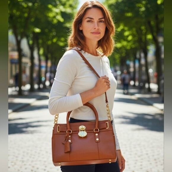 Brown Leather with stylish large Gold Chain accents and Large Gold Logo Emblem. Very nice soft leather.