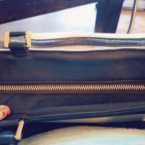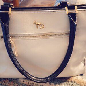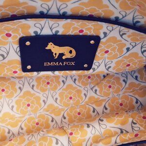 Emma Fox Black and White Leather Purse, 16.5L x 10.5"H x 5.5W. Beautiful two tone purse with gold hardware, yellow print interior that opens wide. Great condition, the only flaw is two slight smudge marks on the front.