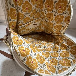 This Emma Fox Lily leather crossbody messenger bag is a stylish and functional accessory for women. The bag features a beautiful floral pattern lining and comes with a top handle and a zip closure for easy access to your belongings. The hardware is gold accent material, which adds a touch of elegance to the bag.