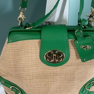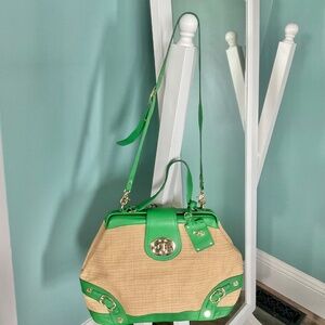 Pre owned in excellent condition Emma Fox Newport satchel purse with green leather and very nice straw/jute body