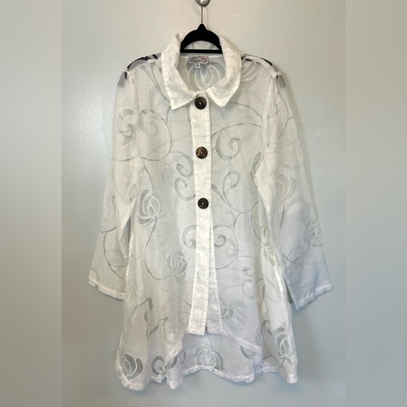 For sale we have an Emma G white sheer floral button up tunic top size medium. The top has pockets. Gorgeous lagenlook style. Linen blend. No stains or tears.