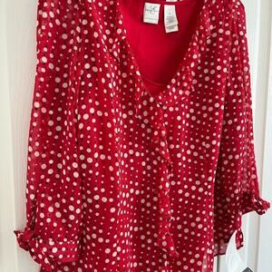 Vibrant red blouse with playful white polka dots. Features a ruffled neckline and sheer sleeves. Plain red tank top underneath, the two are stitched together loosely at the shoulder, you can snip the threads and wear separately.