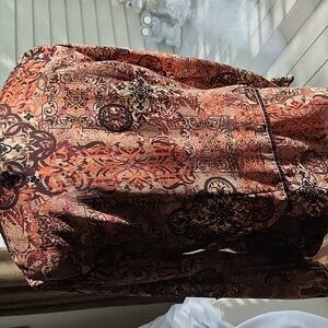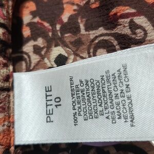 Chic Emma James blouse with a vibrant pattern. Features rich brown and orange tones. Ideal for a fashionable ensemble.
