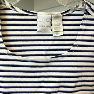 Tank is blue, navy, and white striped and is 95% cotton, 5% spandex with great stretch. It is a size S and is 16" pit-to-pit and is a hair shy of 17" in length, so will likely be a bit cropped depending on torso length and bust size. In excellent condition.