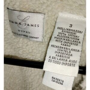 This is a women's Emma James (Liz Claiborne) vest in a size 3, featuring a blue denim outer shell with sherpa lining and button-up closure. It has a collared neckline, pockets, and a Western/outdoors theme. The vest is lightweight, packable, and suitable for winter, summer, fall, and spring. The garment care instructions suggest it is machine washable.