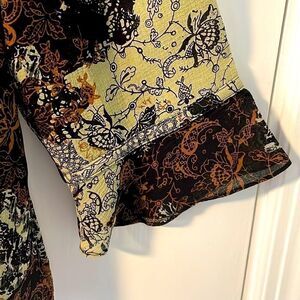 Emma James romantic ruffle earth tone print button front bracelet sleeve blouse size 12. Beautiful print has some paisley and medallion elements in it. Side vents. Lightweight. Just a tiny bit sheer. About 20 inches from under one arm to the other. About 25 inches from shoulder seam to hem. Excellent used condition. EUC. Bundle with more items from my closet to save.