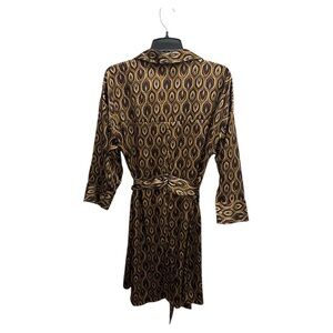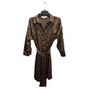 Elegant dress with a striking geometric pattern. Features a button-down front and a stylish belt. Ideal for versatile wear.
