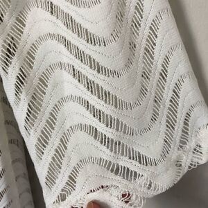 Emma & Michele Cream/Tan 3/4 wide Sleeve Crochet Sheath Stretch Dress. Size Medium. Tan Stretchy liner overplayed with crochet detail. Gold hardware detail on neckline. Excellent condition!