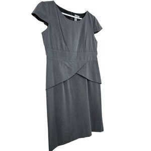 Look sharp and sophisticated in this brand new Emma & Michele sheath dress. This tailored gray dress features a flattering asymmetrical peplum waist, cap sleeves, and a scoop neckline – ideal for work, professional events, or semi-formal occasions.
