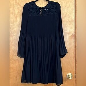 This elegant black dress features a delicate lace neckline and flowing sleeves, perfect for any occasion. The classic black color adds a touch of sophistication to your wardrobe.