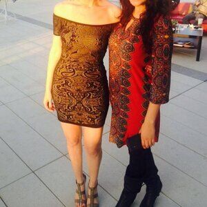 Low maintenance stretchy shift dress with a gorgeous bohemian print by Emma & Michelle. Size Small Petite