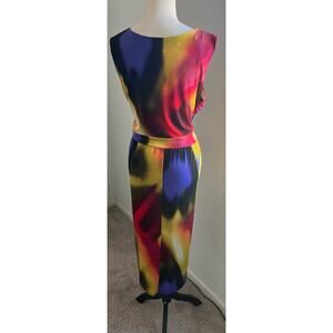 DETAILS: MIDI length. Multicolor sunset hues color. Relaxed fit. V-neck. Sleeveless. Not lined. Pullover. Faux Wrap top and skirt. Polyester and spandex material.