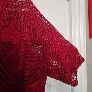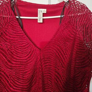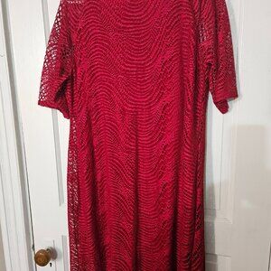 Emma Michelle Red Evening Dress with sparkle and bottom fringe layer SZ XL. Lovely cocktail dress worn one time for business trip. This dress is in great shape and is great for a spring, summer, fall cocktail party. It does have a sparkle to the fabric and is a lacey overlay to a satin-y under dress. 92% Polyester, 4% Metallic, 4% Spandex lining. Hand wash Cold, do not wring, line dry only. No Bleach, Iron on Low.
