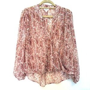 This Emma & Olivia, women's blouse in size L features a floral pattern with hues of pink, mauve, and burgundy. This long sleeve blouse with a V-neckline and cross-over style is perfect for casual, workwear, or business occasions. Made from polyester, this machine washable blouse is ideal for the spring and summer seasons. The regular fit and stylish design make it a versatile addition to any woman's wardrobe.