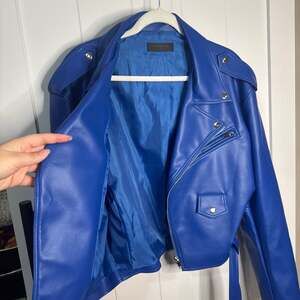 Storets Cobalt Blue Emma Pleather Rider Jacket, Women's Size S/M — Bold Streetwear Essential. This vibrant royal blue motorcycle jacket features a classic biker silhouette with an asymmetrical zip front, belted waist, and notched lapels with silver-tone snap hardware. Designed with functional side zip pockets and a small front flap pocket for added edge.