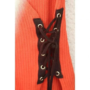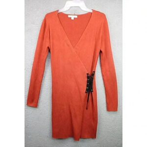 This is a Emma & Posh Women's Ribbed Sweater Dress that is a faux wrap and is a size Large. It is a burnt orange color with a black tie up in the front. This dress would look great with some black boots!! It is 70% Rayon and 30% Polyester. Laying flat, it measures: Armpit to armpit-18" and the length is 35.5". In great condition.