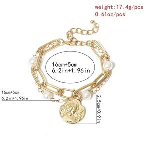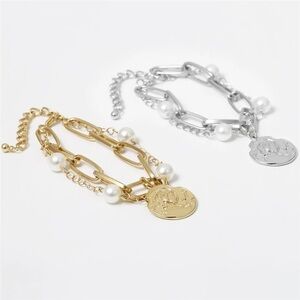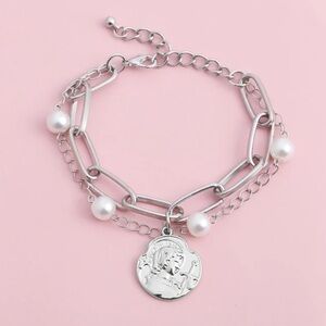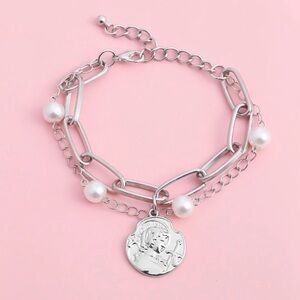 🆕 Emma Silver Toned Boho Chain Bracelet with Faux Pearls and Coin Charm