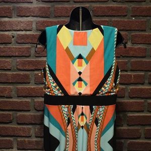 Beautiful, green and orange graphic dress. Sleeveless, high low maxi. Multicolored polyester spandex blend.