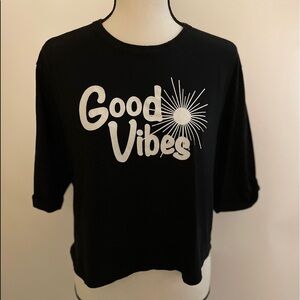Emma & Sam Good Vibes T shirt. Size Small crop style. Black white
