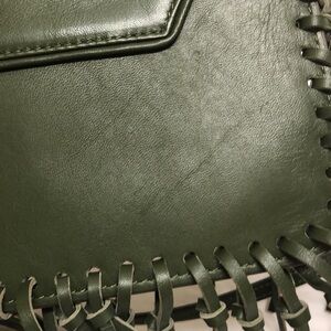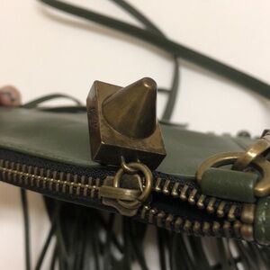 Emm Kuo leather “ Mejorelle Fringe” bag featuring gold tone hardware, top zip closure and removable strap. Lined