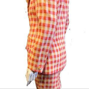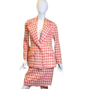 Pink and orange gingham plaid on a winter white background. Jacket has shoulder pads. V-neckline with fringe detailing down the front and accenting the front pockets. Form-fitting A-line skirt with back vent. Jacket and skirt are fully lined.