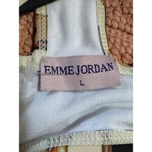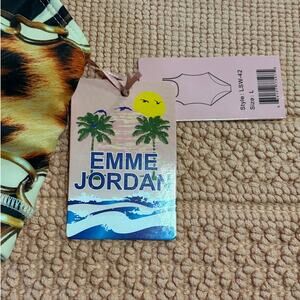New with tags Emme Jordan swim top in size Large. This striking bikini or sport-style swim top features a bold mixed animal print with chain, stripe, and polka dot motifs.