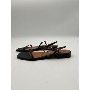 Emme Parsons 'Hope' Black Leather Sandals Size 8 US / EU 38: square toe sandal with thin straps across the bridge and secure around the ankle in patent leather, partially lined in a lightly padded insole and smooth brown leather lining, fastens with a small gold toned buckle.