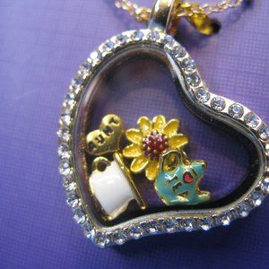 Emmeline floating charm locket necklace with 24" long chain, heart shape with tea pot and cup, sunflower and Aunt heart charms, new in package, never opened.