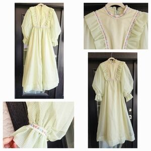 Elegant vintage dress in a soft green hue. Features delicate lace details and puffed sleeves.
