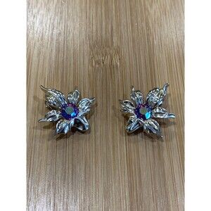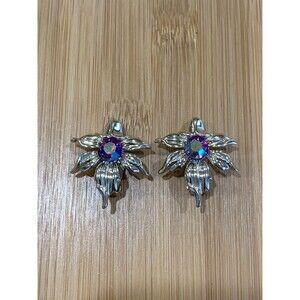 Emmons 1950's Purple Red Aurora Borealis Crystal Flower Clip On Earrings. Condition is Pre-owned. Shipped with USPS Ground Advantage.