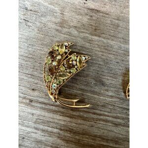 EMMONS YELLOW TAUPE AB OPEN BACK RHINESTONE LILY FLOWER BROOCH PIN EARRING SET