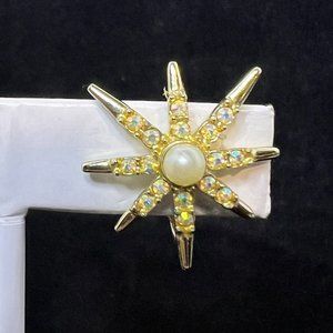Vintage Emmons Gold Tone Aurora Borealis & Faux Pearl Starburst Clip On Earrings.