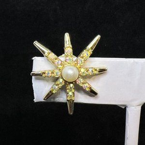 Emmons Gold Tone Aurora Borealis & Faux Pearl Starburst Clip On Earrings (3293)