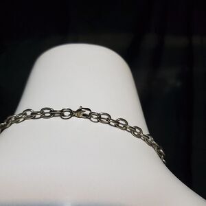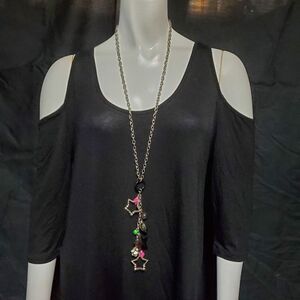 Emo style silver colored chain necklace with a dangling star and heart pendant.
