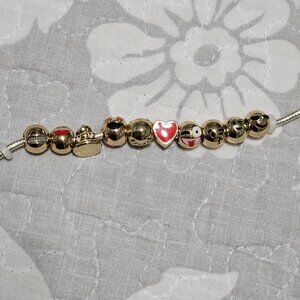 This bracelet features a variety of emoji charms in both gold and silver tones. The bracelet has a lobster closure. It is about 7 inches long.