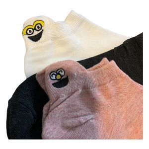 Emoji Smile Face Embroidered Ankle Socks White Black Pink 3 Pairs Cotton
