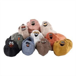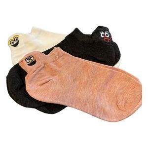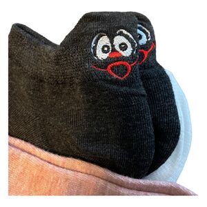 Three Pairs Women's Girl's Cute Emoji Happy Face Socks. They are Embroidered Cotton Novelty Ankle Socks with adorable funny faces on them. Each face is different on each color.