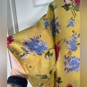 Semi sheer chiffon kimono style cover, yellow with a floral print.