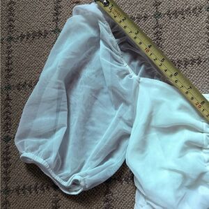 Emory Park white off the shoulder ruched top with adjustable ties in front. Sheer puff sleeves, worn on or off the shoulders. Excellent condition with no rips stains or tears. Gently worn maybe twice? S