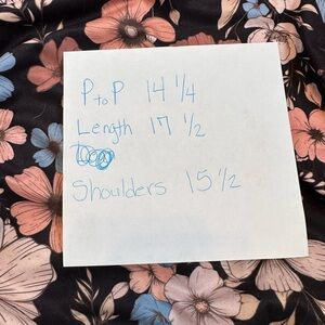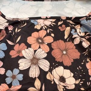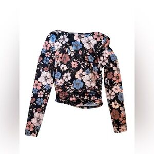 A cute top to wear with jeans or corduroy pants. It is cropped, cinched at the side with a square neck. The floral design is retro and Free People inspired. Black background with blue and tan flowers. Great for fall