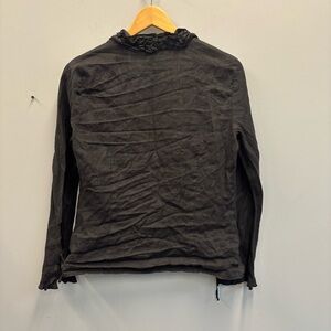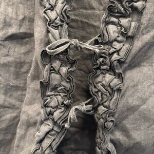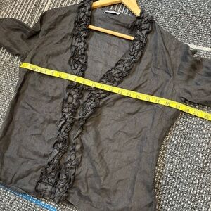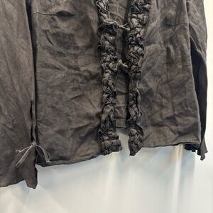Emozioni Linen Cardigan Top Black Ruffled Tie front and wrists
