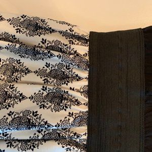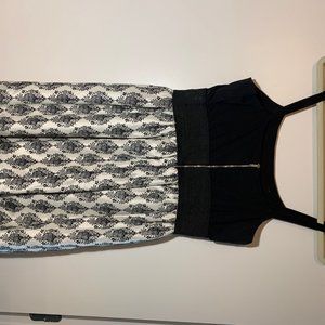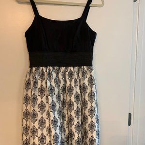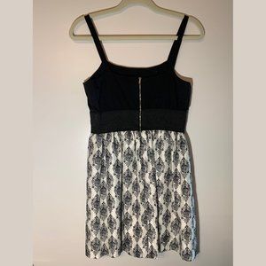Empire waist mini dress with black top, elastic waist band and Black & White skirt in a damask print. Mini length with one layer of built-in crinoline, perfect for spins! Great dress for weddings, homecoming, etc. Has been worn for a few events and has no visible staining, but may need to be dry cleaned as it has been in a closet.