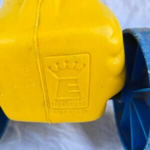 This is an Empire Yellow Horse Rideable Blow Mold from the 1960s. It is 21 inches long, 17 inches deep, and 7 inches wide. This horse is in good condition without any damage. It has some traces of black market on it and some of the paint has rubbed off but there are no cracks or broken pieces. The wheels move as intended.