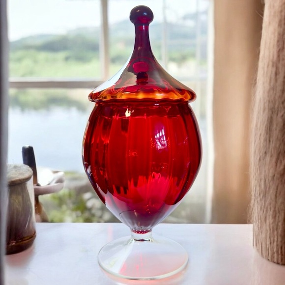 Empoli Italy Amberina Hand Blown Optic Circus Tent Lidded Apothecary Glass Jar