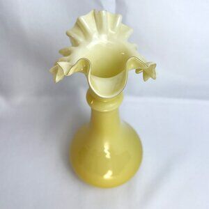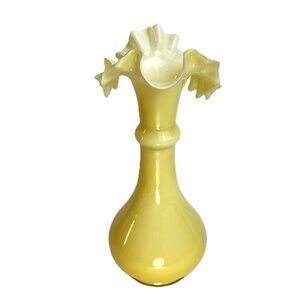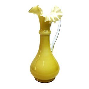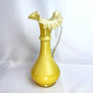 Empoli Style Vintage Yellow Cased Glass Pitcher Vase Ruffled Rim & Clear Handle