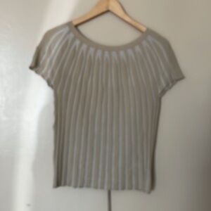 Brown and white ribbed knit (69% Viscose, 31% Polyester). Top. Short sleeves. V-neckline. Ruched tie front. 22" from shoulder to hemline.